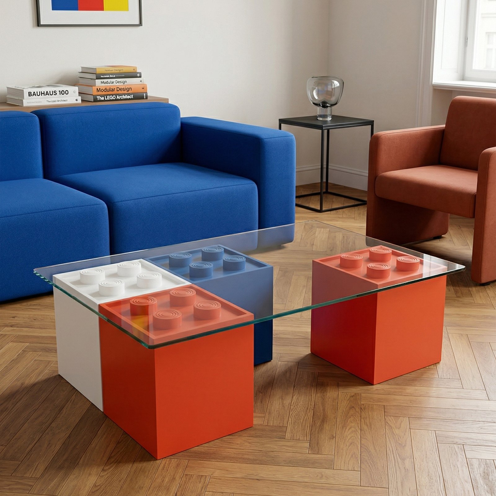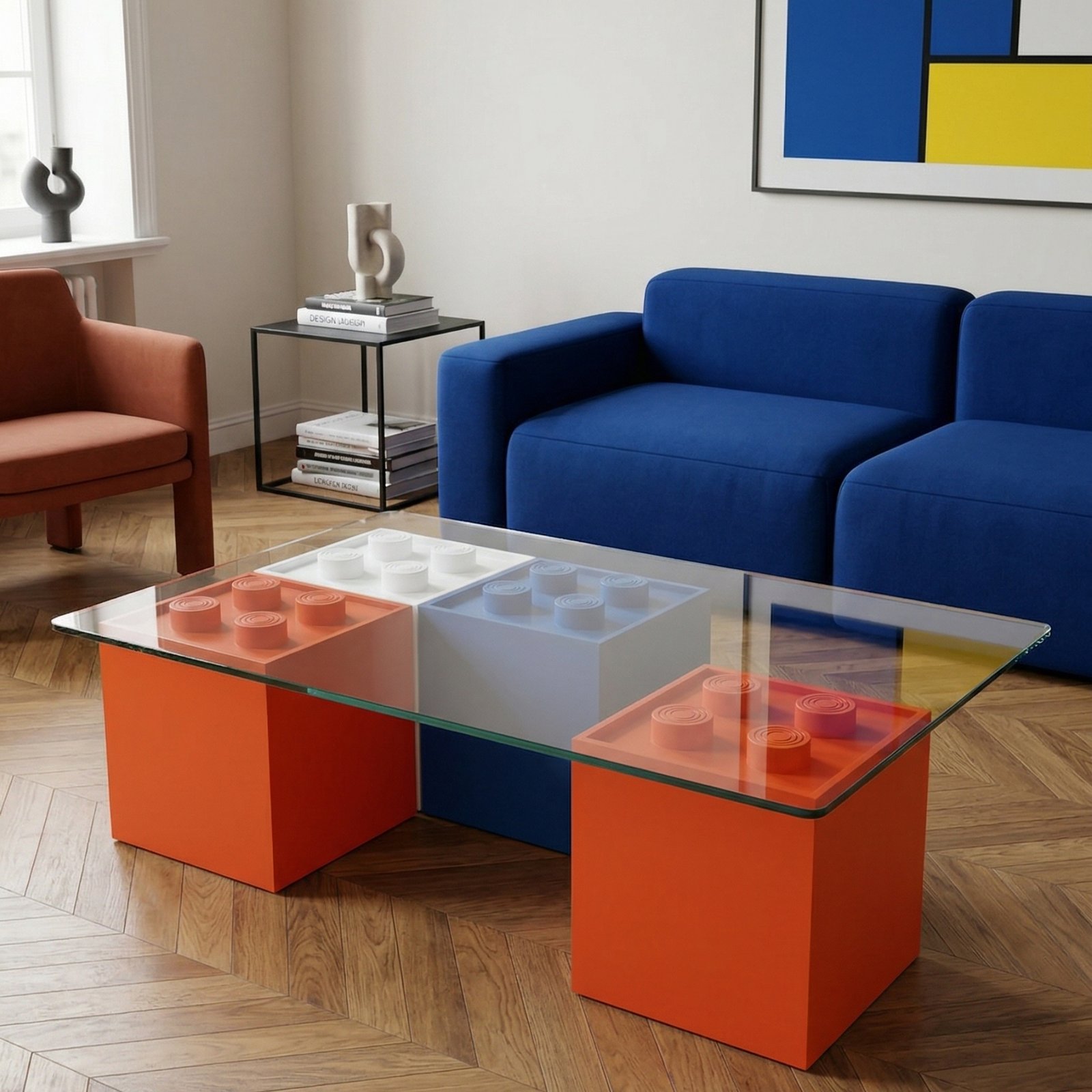 | Boyutlar | Cam yüzey: 110 × 70 cm, Ahşap bloklar: 30 × 30 × 30 cm |